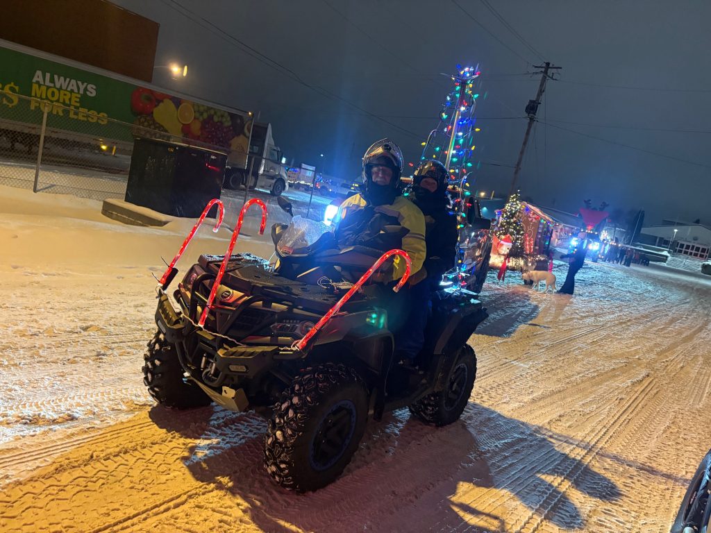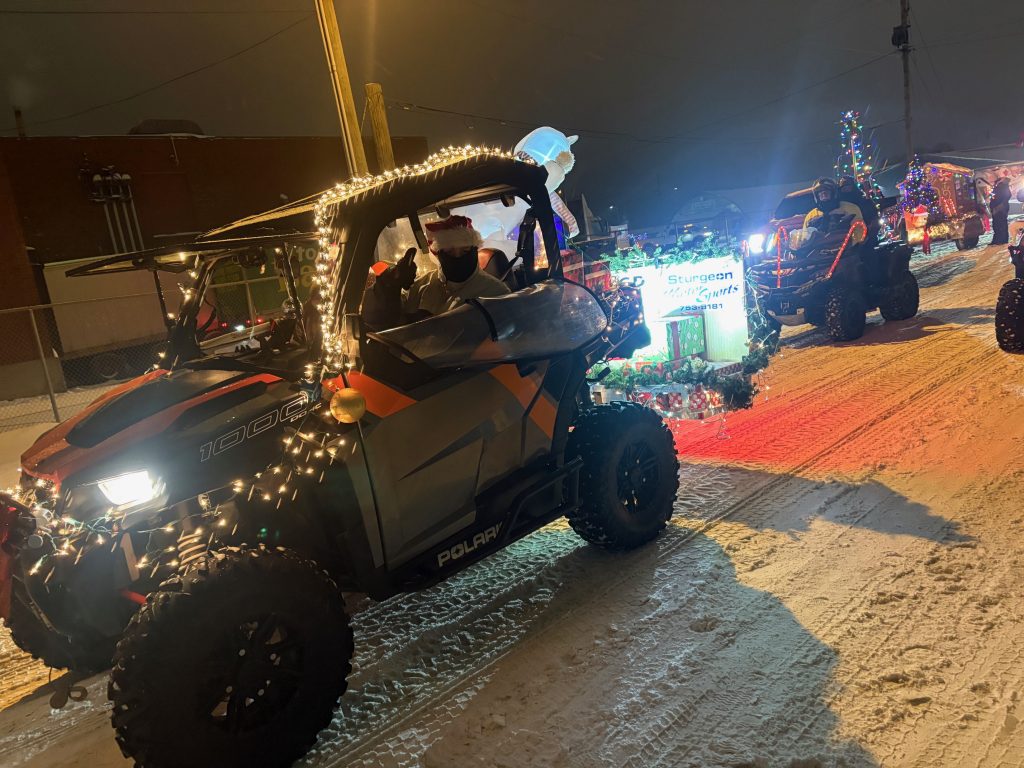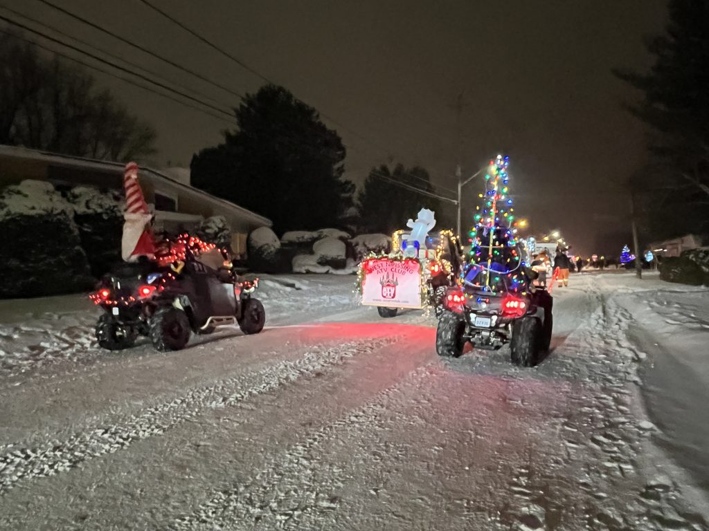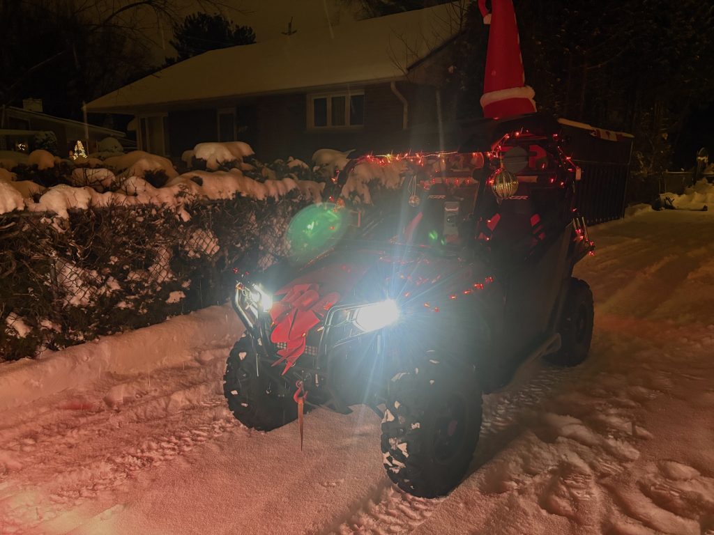 It has been some time since the Club has participated the Sturgeon Falls Parade of Lights, the annual Christmas parade through the streets of town to usher in the holidays. The weather was just right with a light dusting of snow falling with temperatures just under the freezing point. Five members in two SxS and one Quad all gussied up with lights represented the Club during the two-hour parade.