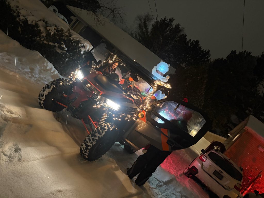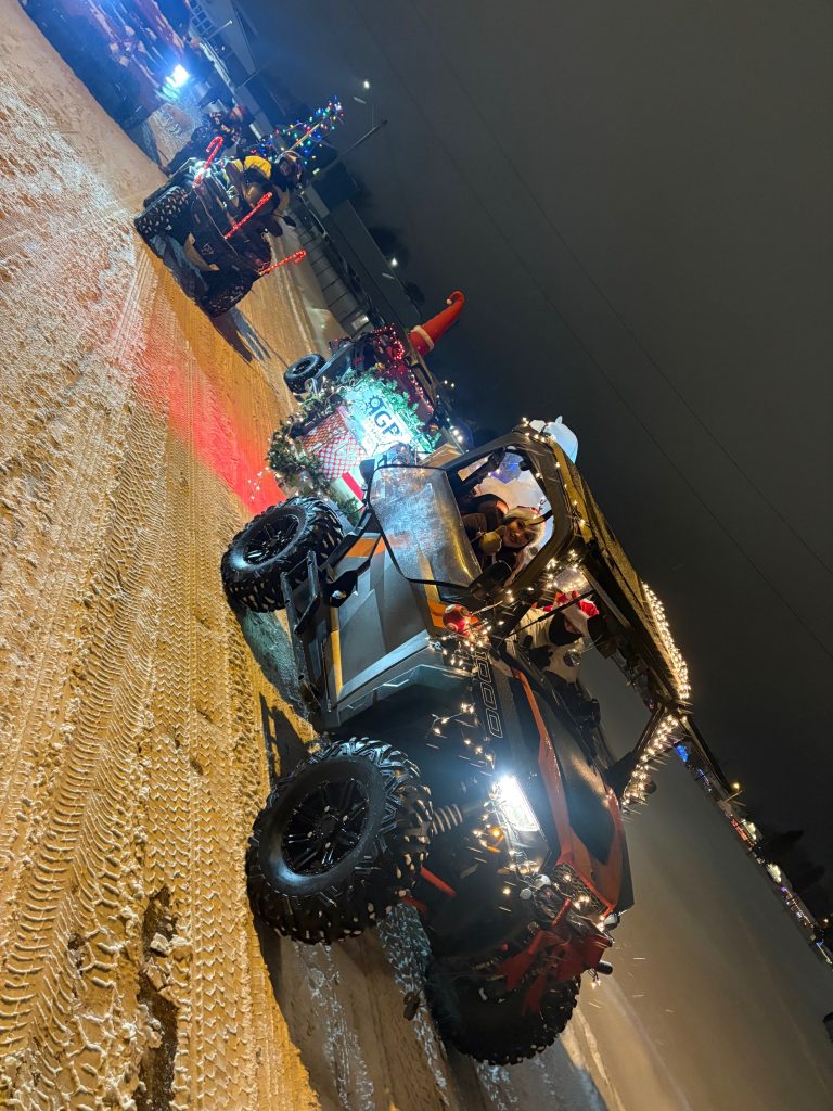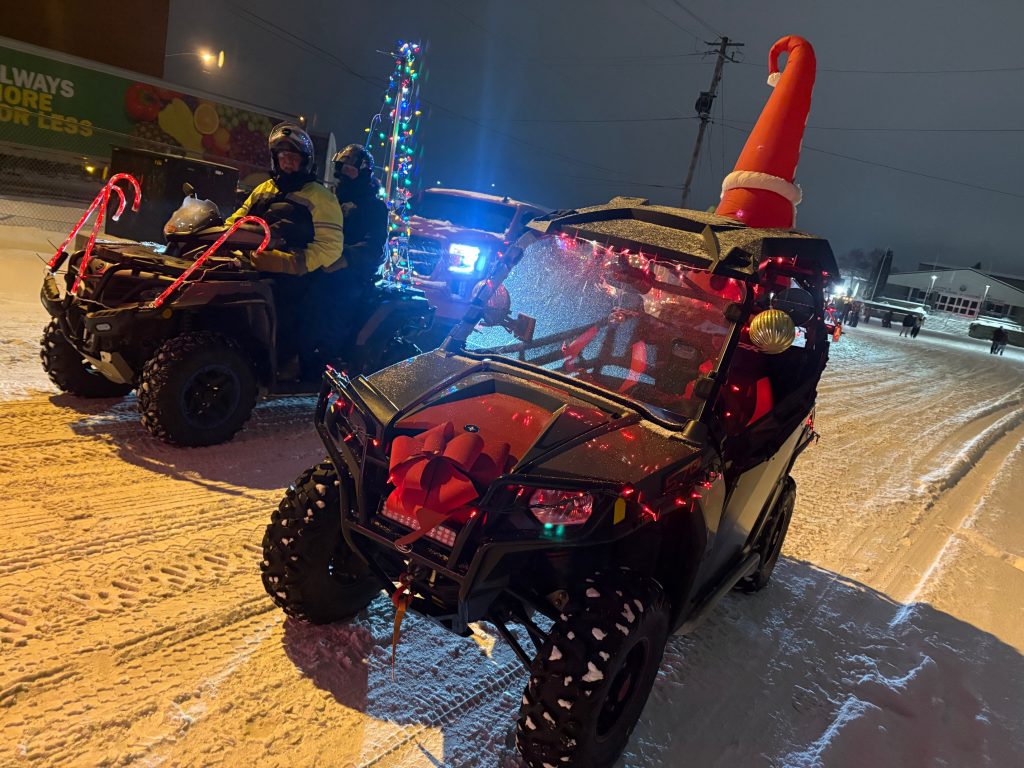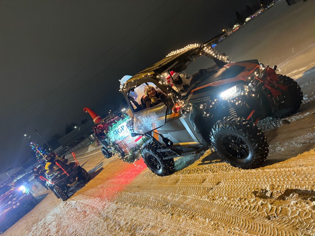 It has been some time since the Club has participated the Sturgeon Falls Parade of Lights, the annual Christmas parade through the streets of town to usher in the holidays. The weather was just right with a light dusting of snow falling with temperatures just under the freezing point. Five members in two SxS and one Quad all gussied up with lights represented the Club during the two-hour parade.